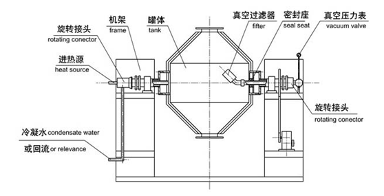 鋰電池材料專用回轉(zhuǎn)真空干燥機(jī)的工作原理是在密閉的夾層中通入熱源,熱量經(jīng)內(nèi)殼傳給被干燥物料,物料從接觸的器壁內(nèi)表面接收熱量,在動(dòng)力驅(qū)動(dòng)下,罐體作緩慢旋轉(zhuǎn),罐內(nèi)物料不斷地混合,從而達(dá)到強(qiáng)化的目的;物料在真空狀態(tài)下,不斷翻轉(zhuǎn),氣壓下降使物料表面的溶劑達(dá)到飽和狀態(tài)而蒸發(fā)了,濕物料吸熱后蒸發(fā)的水汽,通過真空泵經(jīng)真空排氣管被抽走。物料內(nèi)部的溶劑不斷地向表面滲透、蒸發(fā)、排出,三個(gè)過程不斷進(jìn)行,從而加快物料的干燥,物料短時(shí)間內(nèi)達(dá)到干燥目的。比靜態(tài)真空干燥機(jī)節(jié)省大量時(shí)間,提高勞動(dòng)生產(chǎn)力。